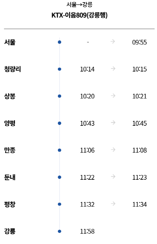 - 소요 시간: 서울역 기준 약 1시간 54분 (강릉역 하차)