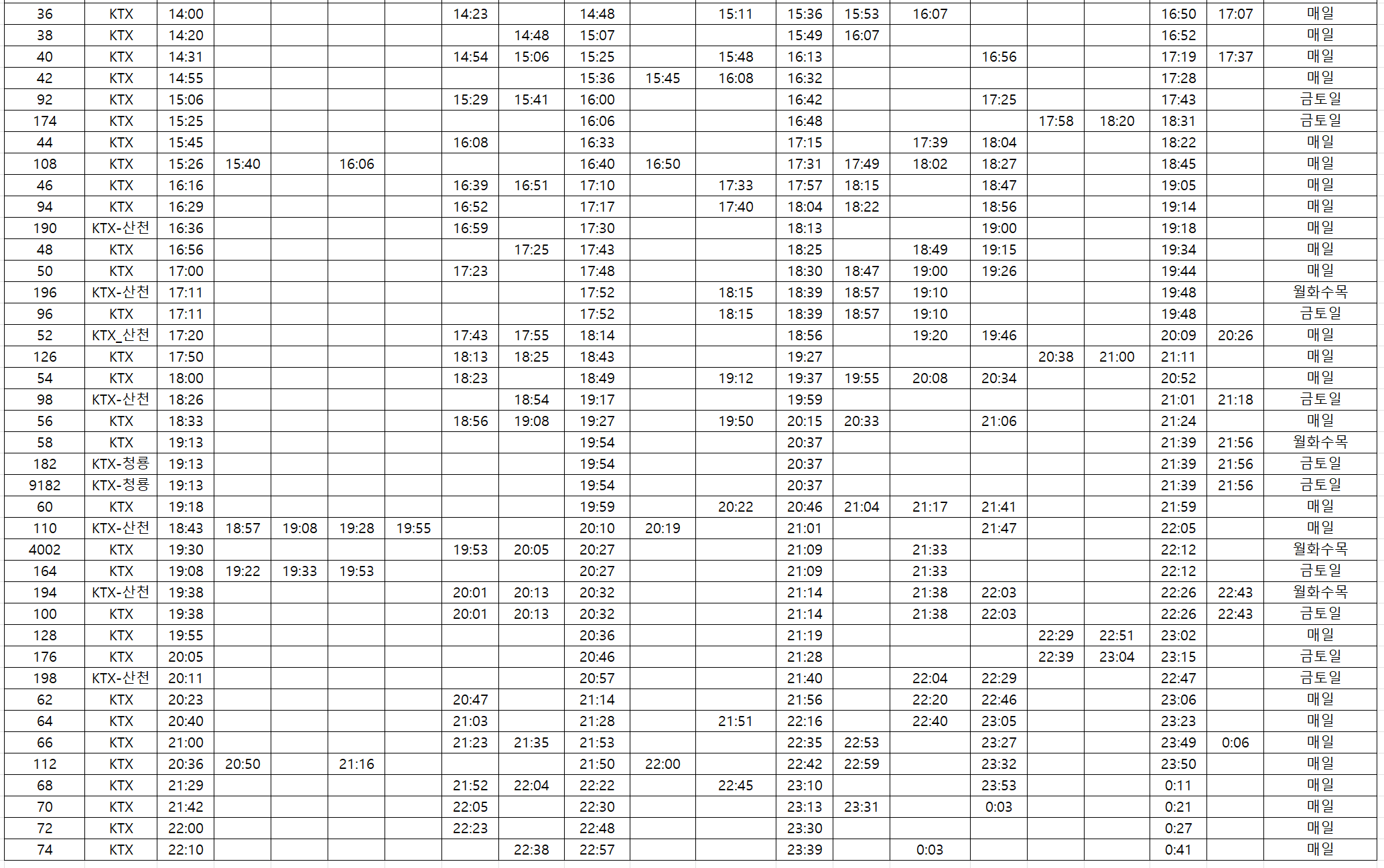 ☑️ 경부선 KTX 열차시간표 - 하행(2)