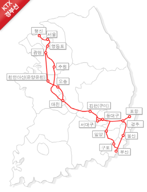 주요 경유지: 서울 - 광명 - 천안아산 - 오송 - 대전 - 김천(구미) - 동대구 - 신경주 - 울산 - 부산
