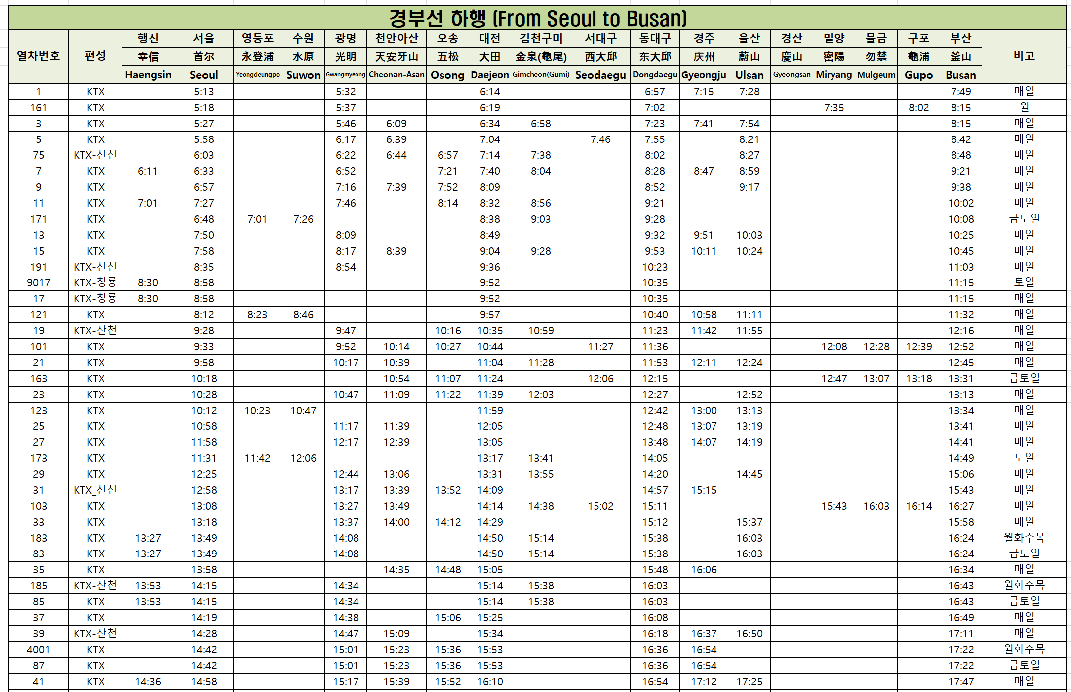 ☑️ 경부선 KTX 열차시간표 - 하행(1)
