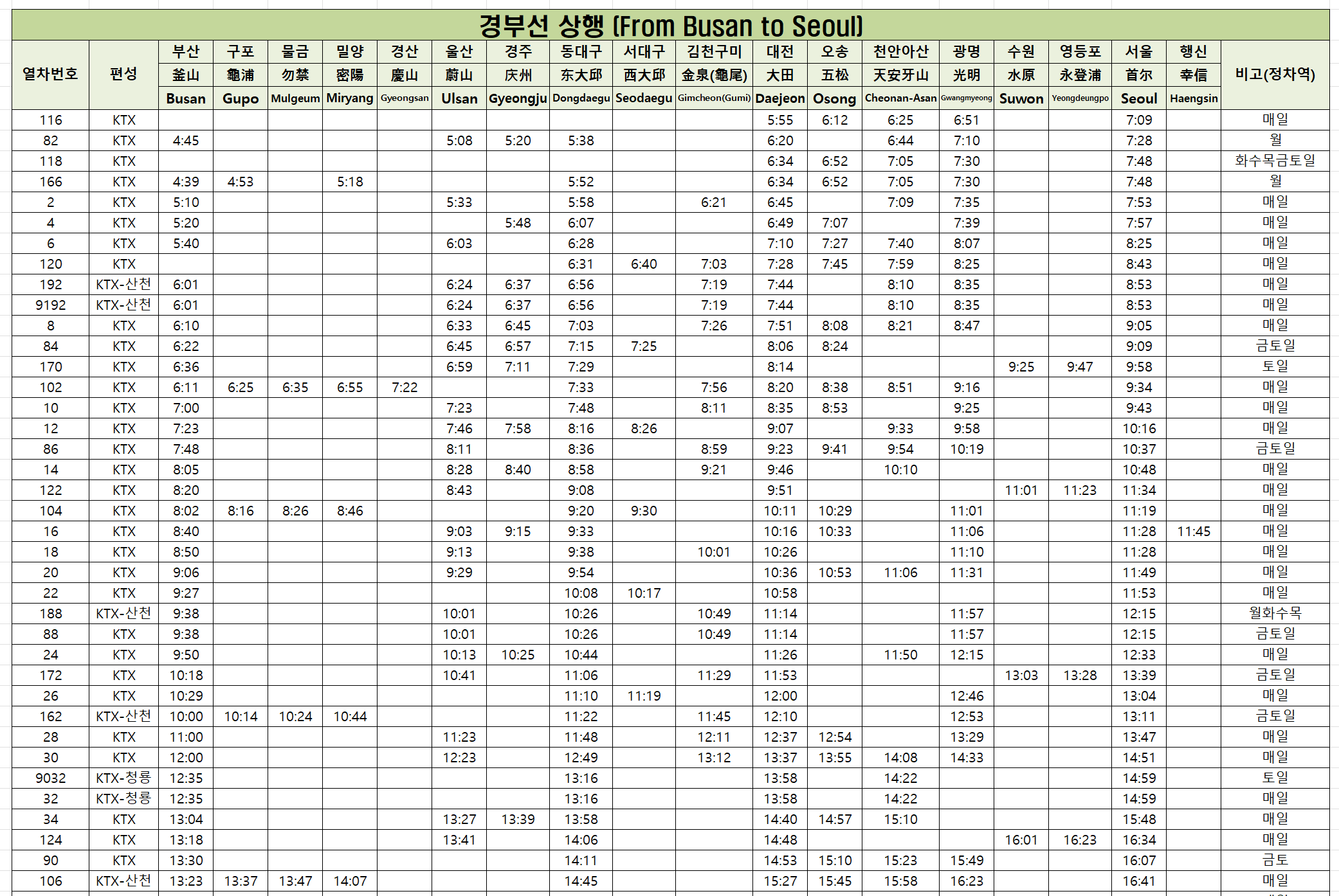 ☑️ 경부선 KTX 열차시간표 - 상행(1)