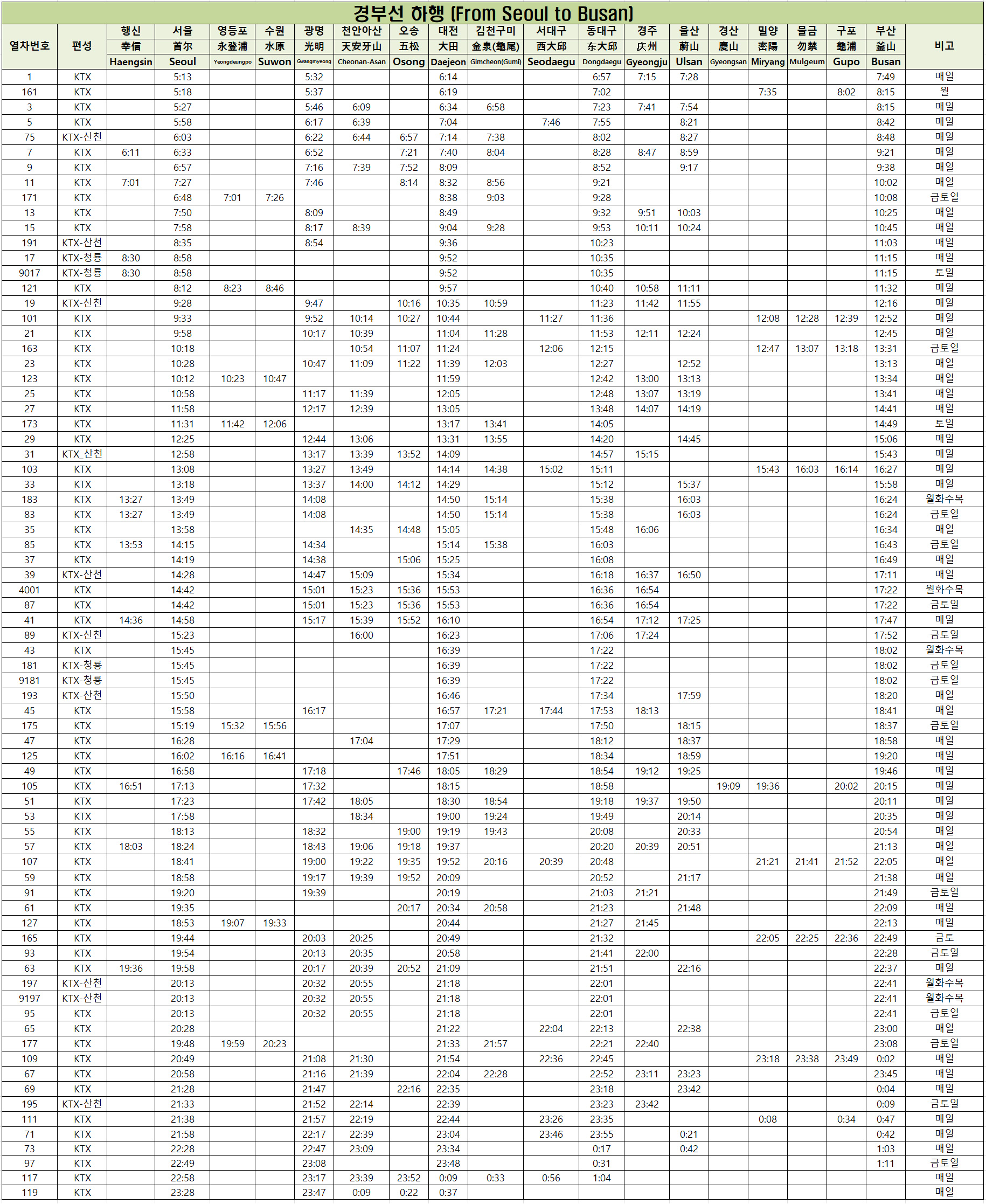 ☑️ 경부선 KTX 열차 시간표는 문서로 정리가 되어 있으니 열차시간표 문서 다운 받아서 보실 수 있습니다.