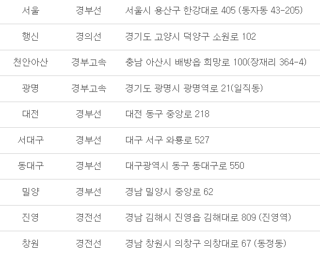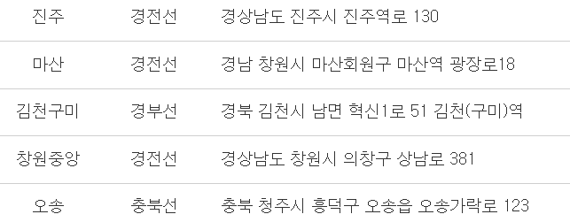 주요 역: 서울역, 대전역, 동대구역, 마산역, 진주역