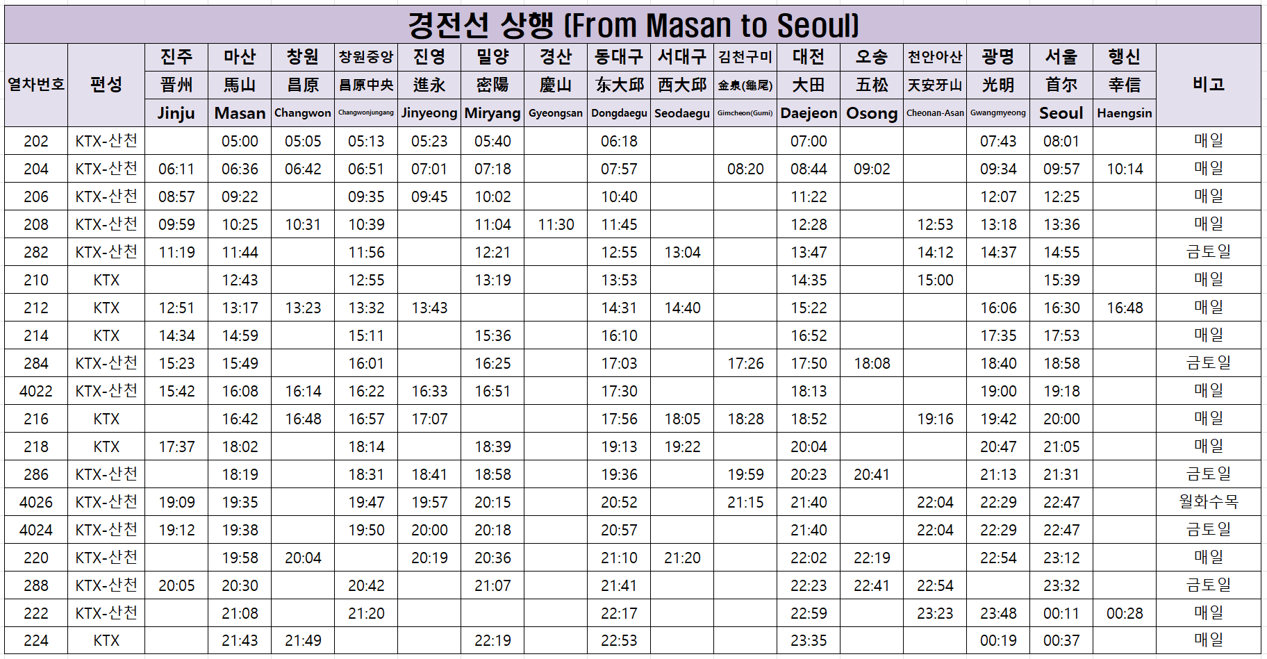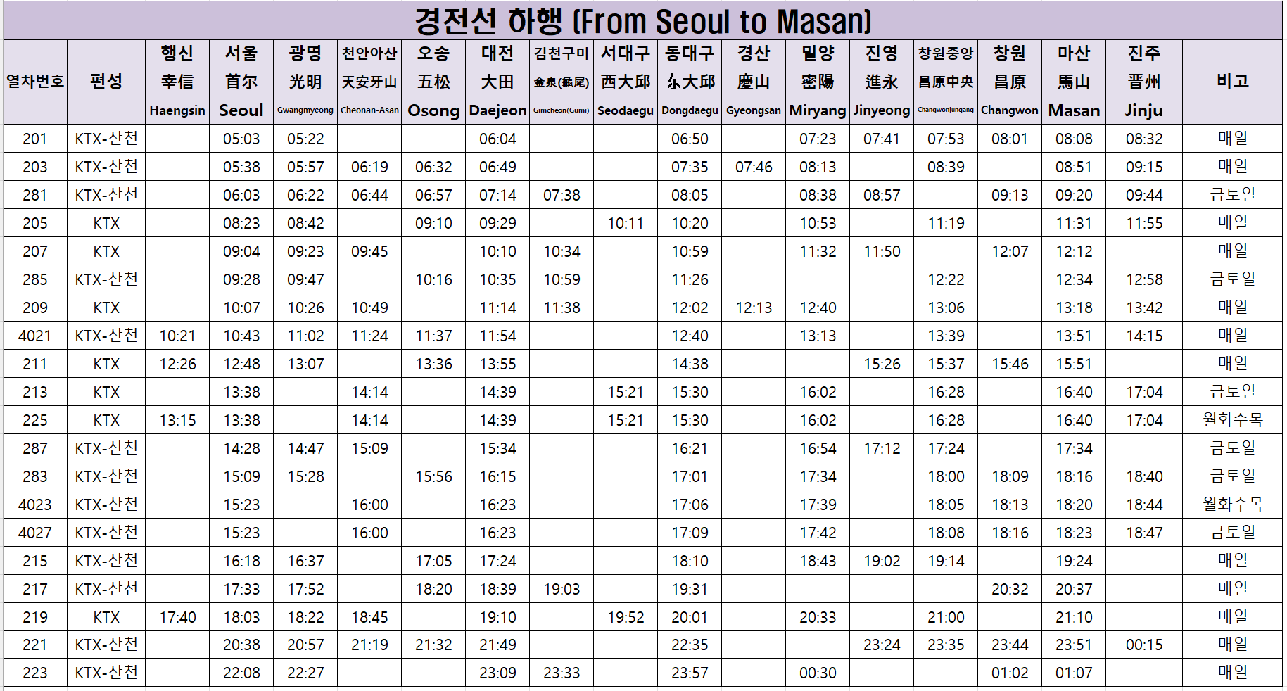 - 막차: 서울역에서 22:07 출발, 마산역에 익일 01:07 도착.