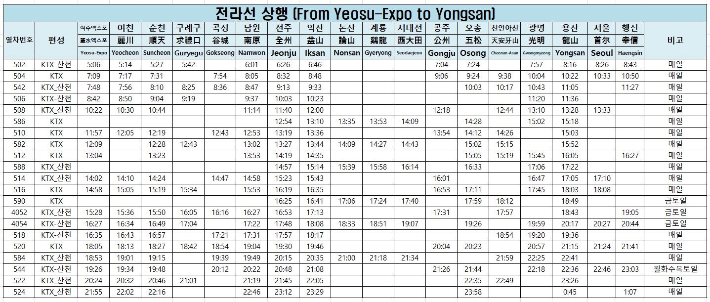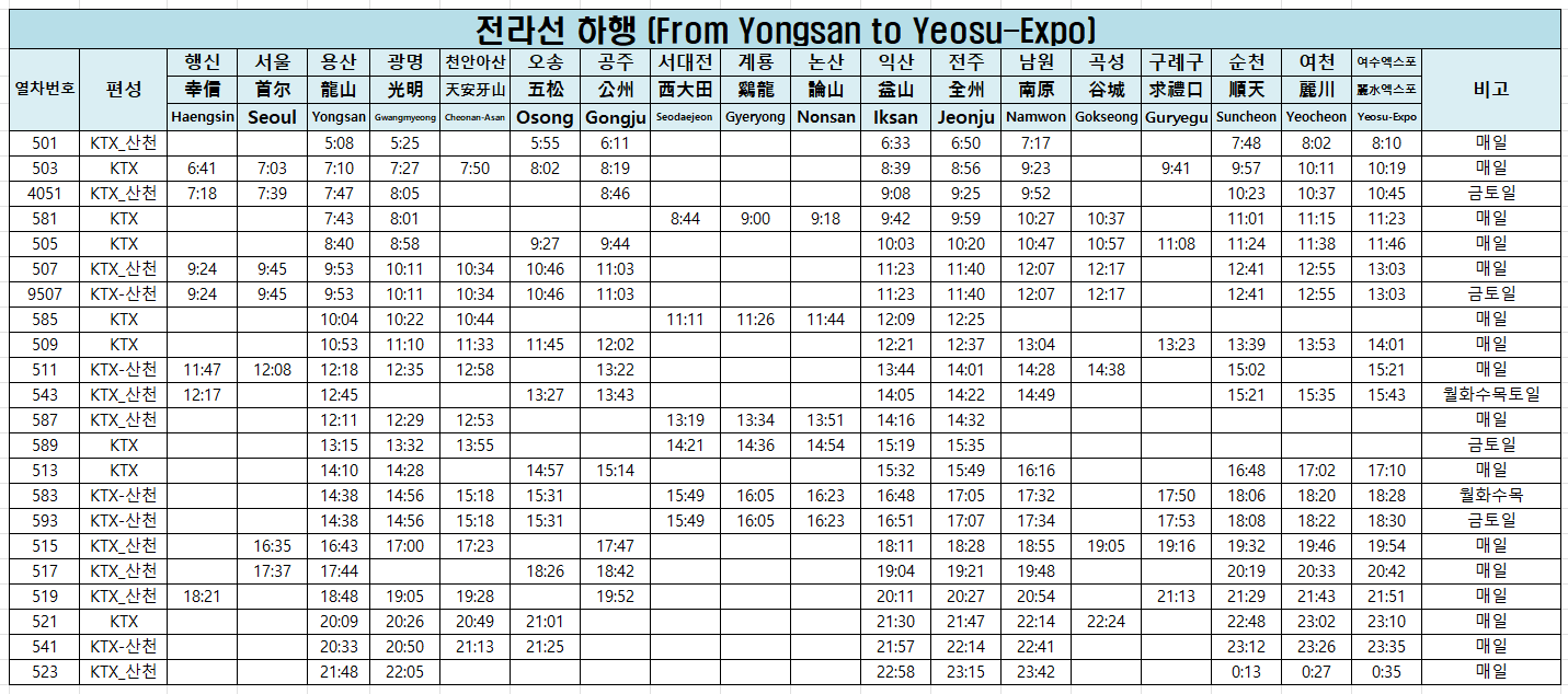 주요 역: 서울역, 용산역, 익산역, 순천역, 여수엑스포역