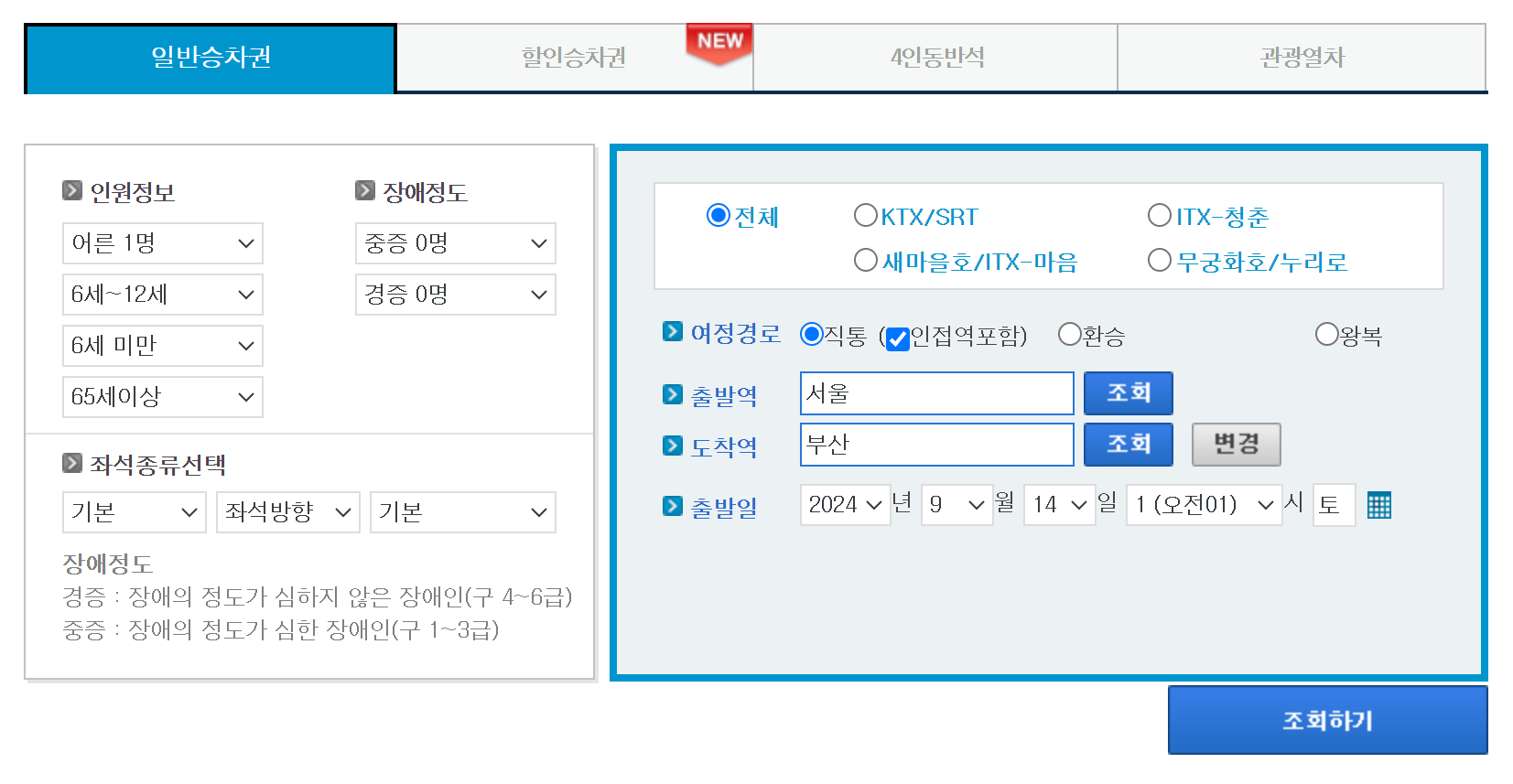 1) 코레일 홈페이지에서 출발역과 도착역을 선택합니다.
