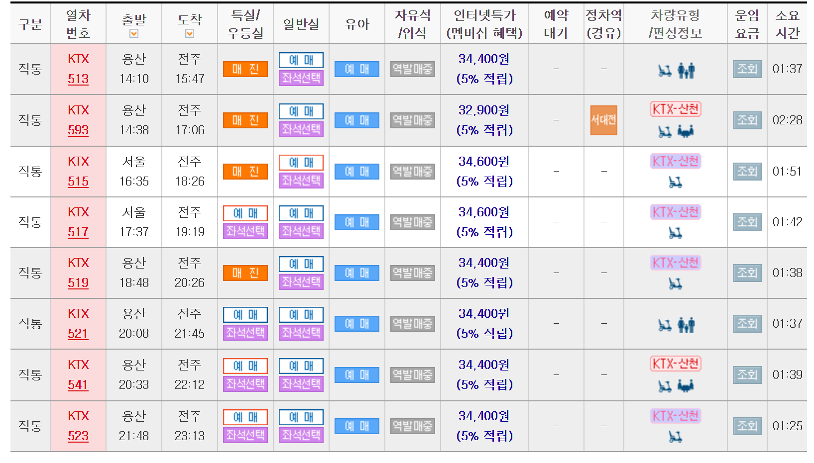 3) 출발역 서울역과 도착역 전주역을 선택하고 조회합니다.