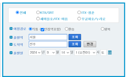3) 출발역 서울역과 도착역 전주역을 선택하고 조회합니다.