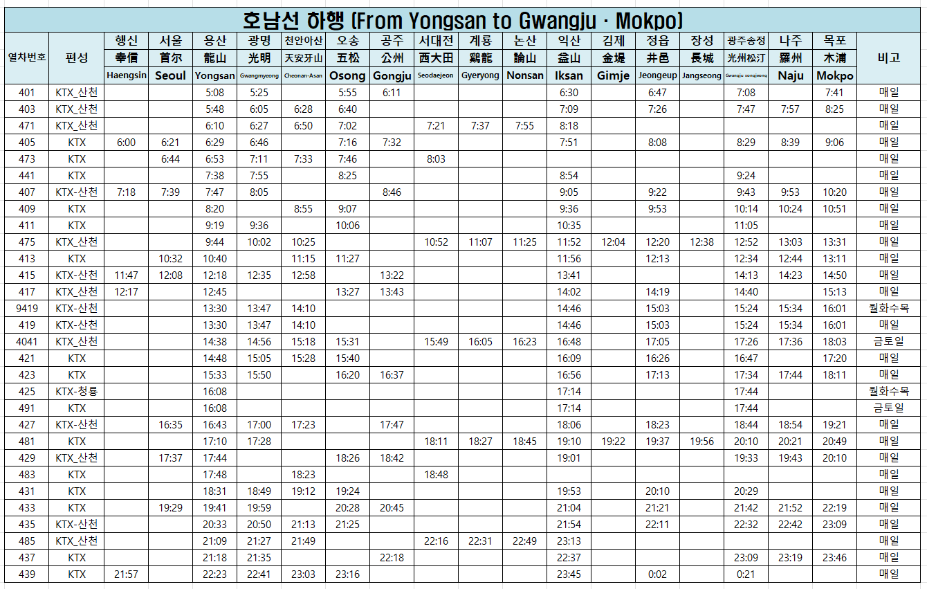 ☑️ 호남선 KTX 열차시간표 - 하행