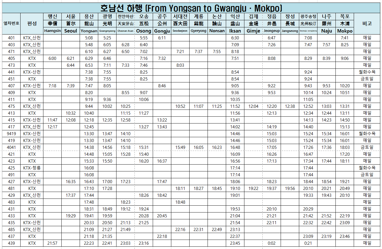 ☑️ 호남선 KTX 열차시간표 - 하행