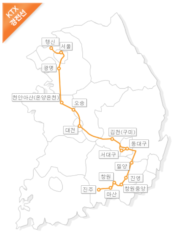 주요 역: 서울, 광명, 천안아산, 대전, 동대구, 밀양, 창원중앙, 창원, 마산, 진주