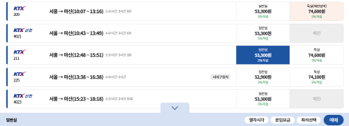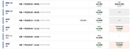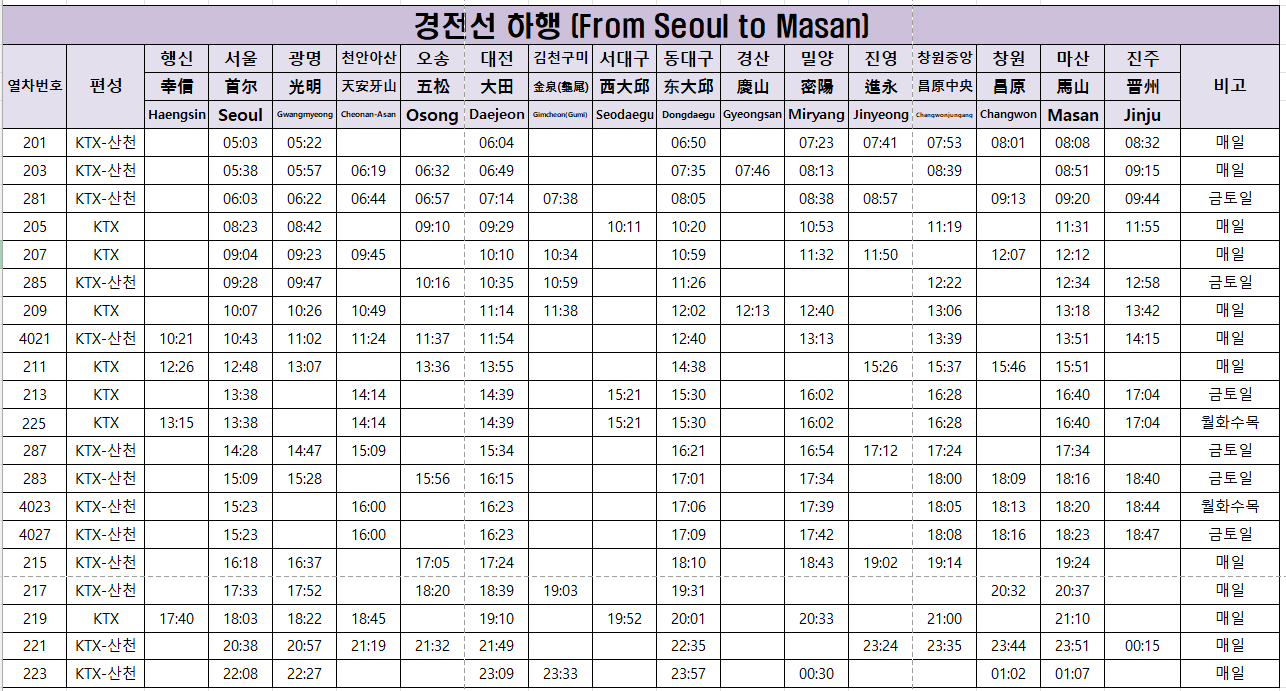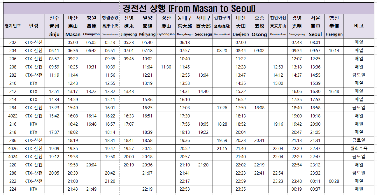 - 막차: 서울역에서 22:07 출발, 마산역에 익일 01:07 도착.