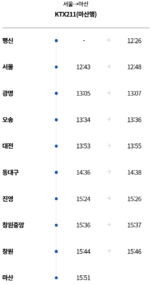 - 막차: 마산역에서 21:43 출발, 서울역에 익일 00:37 도착.