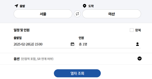 1) 코레일 홈페이지에서 출발역과 도착역을 선택합니다.