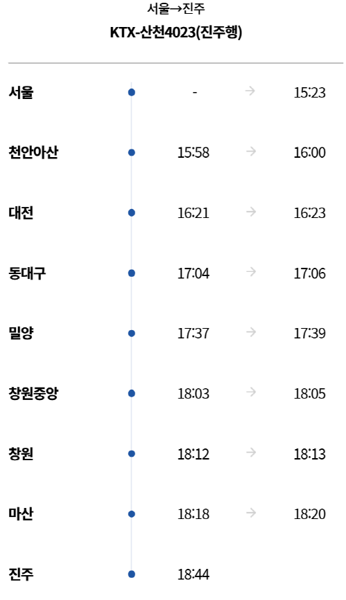 - 첫차: 서울역에서 05:02 출발, 진주역에 08:33 도착.