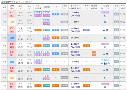 ✅ 시간 및 열차 선택: 조회된 시간표 중 원하는 시간대와 열차를 선택한 후 예매 버튼을 클릭합니다.