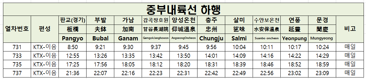 ☑️ KTX 중부내륙선 열차시간표 - 하행