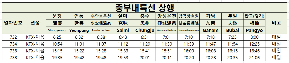 ☑️ KTX 중부내륙선 열차시간표 - 상행
