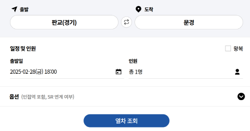 1) 코레일 홈페이지에서 출발역과 도착역을 선택합니다.