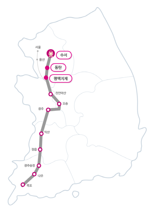 주요 경로: 수서 - 동탄 - 천안아산 - 대전 - 동대구 - 부산