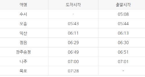 수서역 출발: 매일 오전 5시 8분부터 밤 9시 8분까지 운행 하고 있습니다.